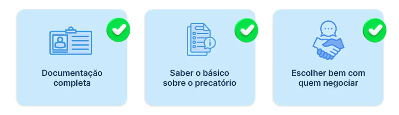 - Conheça seu precatório: quanto mais informações você tiver, mais rápida e assertiva será a negociação. Caso ainda não tenha acessado, veja como receber seu precatório.